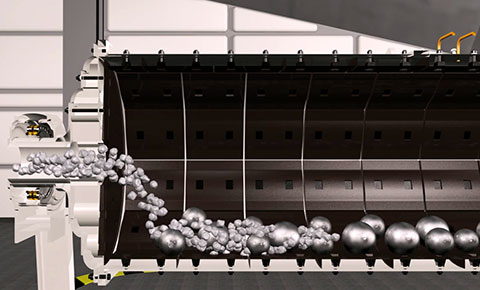 | 型号 | 筒体转速 (r/min) | 装球量 (t) | 给料粒度 (mm) | 出料粒度(mm) | 产量 (t/h) | 电机功率(kW) | 重量(t) |