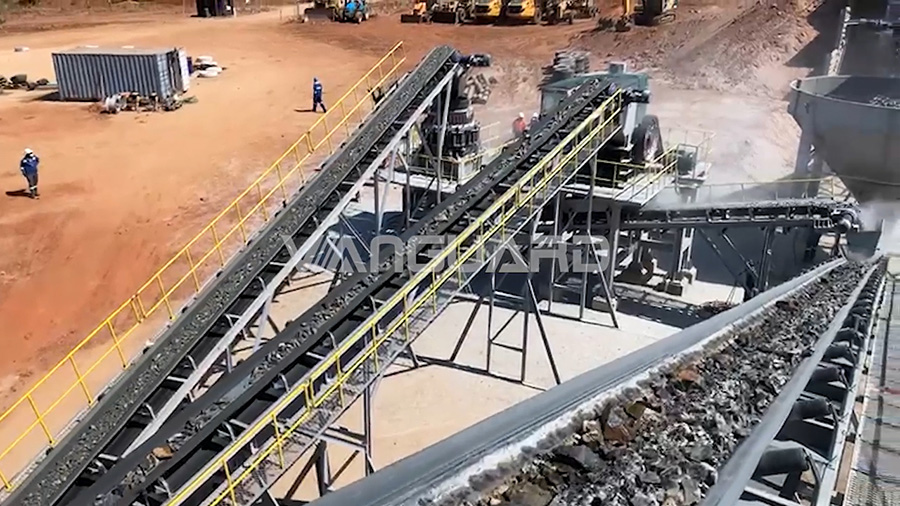 破碎过程中,大块的金矿石经料仓由振动给料机均匀地送进鄂式破碎机或移动颚式破碎站(初破)进行粗碎;粗碎后的金矿石由皮带输送机送到圆锥式破碎机进行中碎和细碎,较终经振动筛筛选成约0-10mm的小颗粒。
